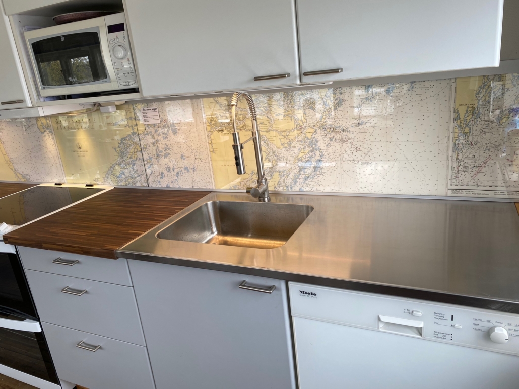 Under vårvintern har köket i Baggenstugan fått en välbehövlig uppgradering när det gäller funktion och form. Kronan på verket är de nya stänkskyddet i glas framför ett sjökort. Det kunde möjliggöras av sponsring från våra vänner på glasbolaget.se Det blev så fint! Kom förbi och kolla!